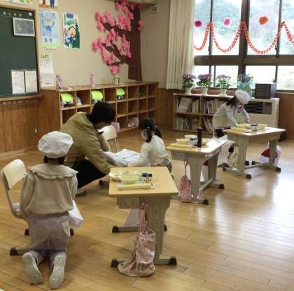 1年生は、小学校で初めての給食、初めての給食当番です。エプロンに着替え、こぼさないように丁寧に盛り付けをしました。メニューは、カレーライス・コーンサラダ・たこナゲット。「おいしいね」とにこにこ顔で頬張っていました。