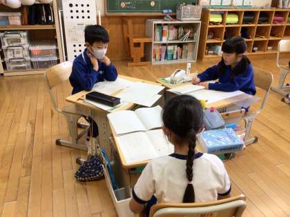 3年生が国語で「すいせんのラッパ」を学習しています。今日はグループで、わからない言葉を調べたり、場面の様子や登場人物の気持ちから、どんな読み方をしたらよいかを話し合ったりしていました。「ここは急いでいるから速く読んだ方がいいよ」「ここは大きい声だね」など、友達と相談しながら進めていました。
