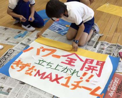 5年生の級訓「パワー全開 立ち上がれ!! きずなMAX1チーム」の教室掲示用のポスター作りをしました。デザインを考え、協力して色塗りや飾り付けをしました。声を掛け合いながら、仕上げていく様子に7人のきずなが見られました。