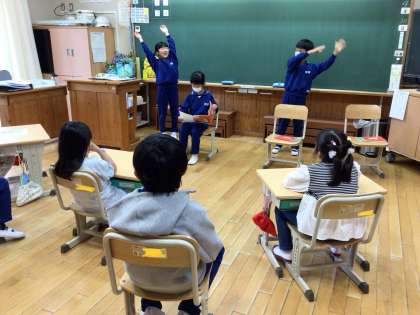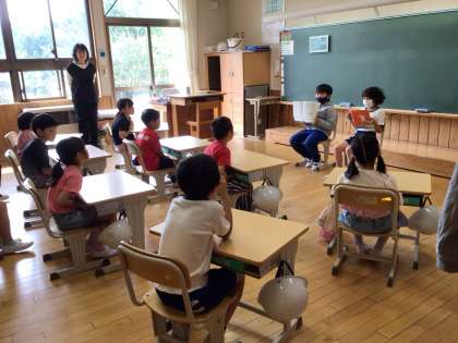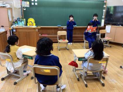 3年生が国語で「すいせんのラッパ」をどのように読むと様子や登場人物の気持ちが伝わるか考え、音読の練習をしてきました。上手に読めるようになったので、1・2年生に聞いてもらいました。聞いている子によくわかるように、絵を見せたり動作をつけたりとさらに工夫しました。1・2年生からたくさんの拍手をもらい、3年生も大満足です。