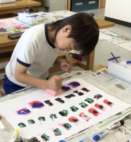 4年生 図工「見つめよう 感じよう 形と色のいい感じ」の学習です。スポンジやブラシなどで絵の具をつけ、様々な色や形の重なりを楽しみました。