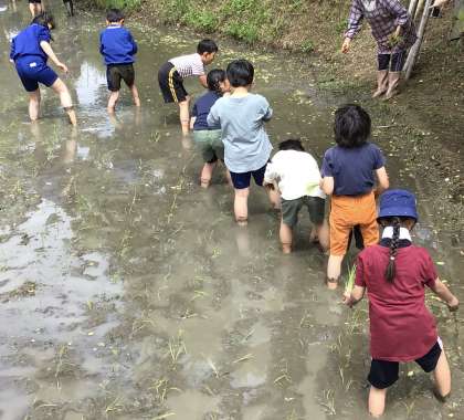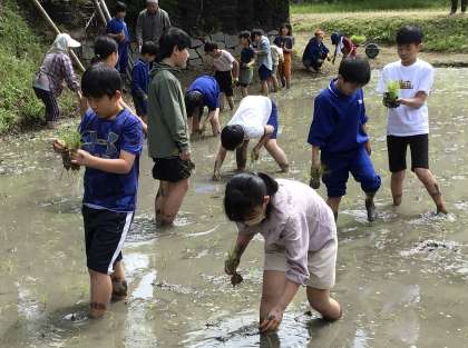 3年生から6年生で、田植えをしました。地域講師の方に苗の持ち方や植え方を教えていただき、おそるおそる田に入りました。泥に足を取られ、思うように動けず四苦八苦しながらも、手で全て植えることができました。苗の成長を見たり地域の方の思いを聞いたりして、米作りの良さや大変さを感じてほしいと思います。