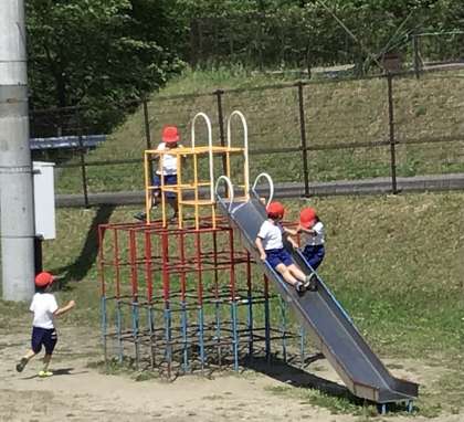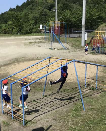 長い休み時間は わんぱくタイムとフレッシュタイムと呼び、校庭で遊べる時間です。今日は久しぶりの青空の下、鬼ごっこや遊具遊びを楽しんでいました。