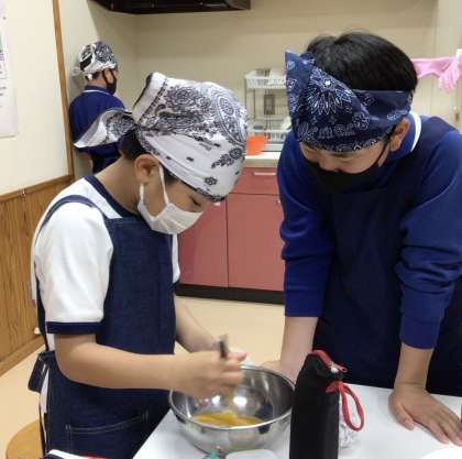 6年生が家庭科の学習で、卵焼き作りに挑戦しました。手際よく卵を割りよく混ぜ、巻き方も大変上手で、家での練習の成果がよく表れていました。できた卵焼きは、互いに味見をし、友達の家庭の味を楽しみました。