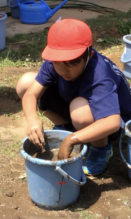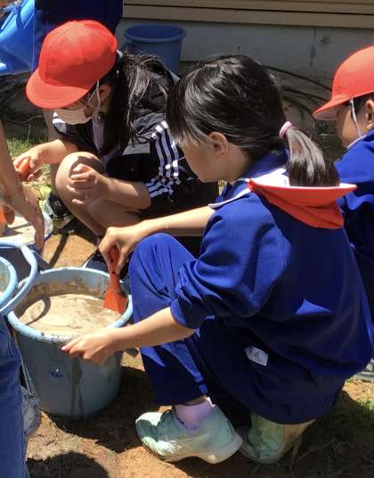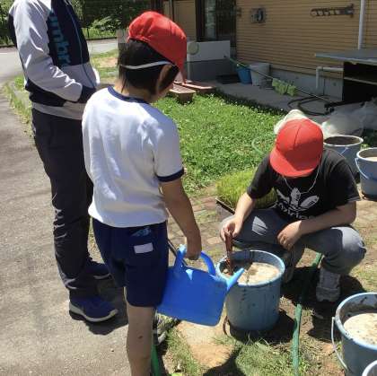 5年生が田植えの一環として、バケツ稲に挑戦しました。バケツに土と水を入れ、混ぜ合わせます。土を平らにしたら、いよいよ苗を植えます。手を泥だらけにしながら、田と同じような状態にして、そっと苗を植えていました。収穫を楽しみに、少しずつ成長していく様子を観察していきます。