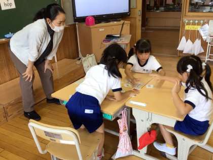 今日は、ALTによる英語学習の日です。1・2年生は「動作を表す言葉」を学びました。まず、立つ・座る・歩く・泳ぐなどの言葉の練習をしました。その後、ミッシングゲームやカードゲーム、ジェスチャーゲームなどを楽しみながら、言葉を覚えました。最後は、動作を表す歌をジェスチャーつきで歌い、盛り上がりました。