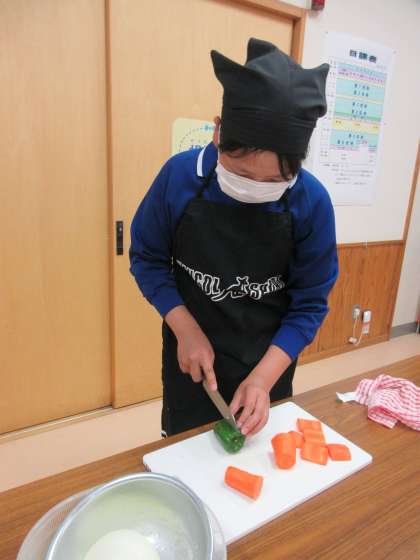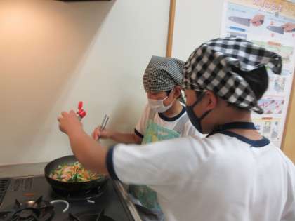 6年生が家庭科で調理実習を行いました。メニューは、野菜炒めです。野菜やハムを切り、炒めて、塩・胡椒で味付けしました。栄養バランスや彩りもバッチリ、美味しくできました。