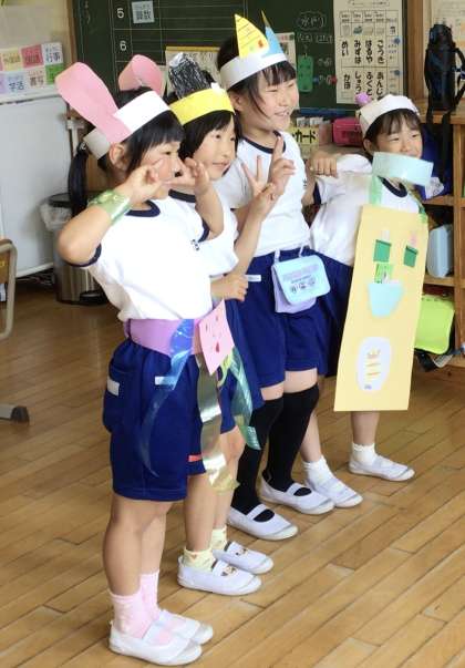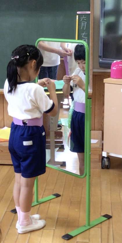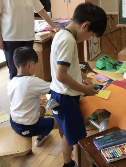 2年生が図工で「わっかでへんしん」の学習をしました。画用紙を輪にし、飾りをつけていきます。身に付けると、なりたいものに変身です。鏡を見たり、友達と相談したりしながら、変身する自分を楽しみました。