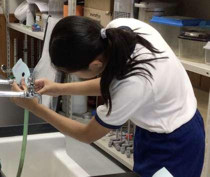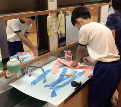 5年生が図工「あんなところがこんなところに」の学習で、校内の気に入った場所を楽しく作り変えました。理科室の水道の蛇口が象になったり、ランチルームに防犯用赤外線があったり、手洗い場がお風呂場になったりしました。見慣れた場所も、視点を変えると新しい見方ができることがわかりました。