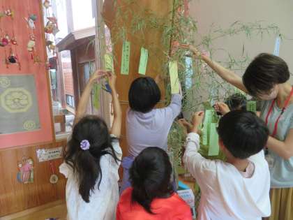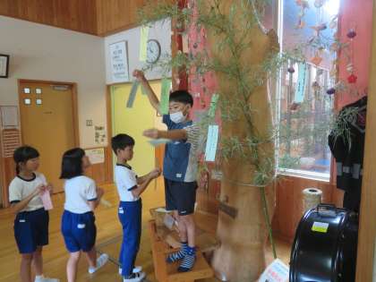 それぞれの願いを短冊に書いて、玄関に設置された笹の葉に飾りました。