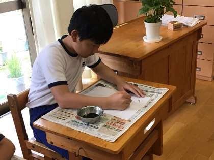6年生が図画工作科で「墨と水から広がる世界」の学習をしました。割り箸に墨汁をつけ、和紙に描いていきます。限られた材料の中でも豊かな表現ができることを楽しみ、試行錯誤しながらイメージを広げていました。