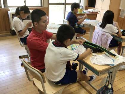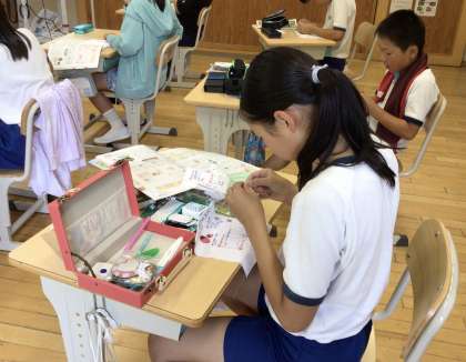 5年生が家庭科で「ひと針に心をこめて」の学習で、手縫いに取り組んでいます。針に糸を通すこと、玉結び、玉どめなど初めてのことに四苦八苦しながら、なみぬいやボタンつけに取り組んでいます。