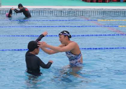 今年度最後の水泳学習です。今日は、水泳選手の方に来ていただきました。まず、バタフライやクロールで泳いでいただきました。あまりの速さに、子どもたちは大変驚いていました。その後、泳ぎを見ていただき、アドバイスを受けました。具体的に教えていただき、泳ぎに自信をもてたようです。