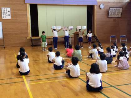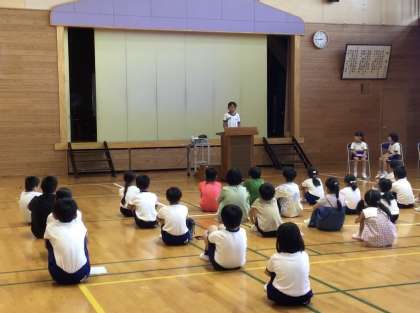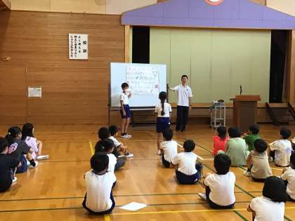 夏休み前集会を行いました。はじめに、2年生と4年生の子の意見発表を聞きました。次に校長先生から「命を大事にしよう」というお話を聞きました。続いて、保健給食委員会から「熱中症に気をつけよう」、生徒指導の話などを聞きました。明日から夏休みです。健康や安全に気をつけて、有意義に過ごしてほしいと思います。