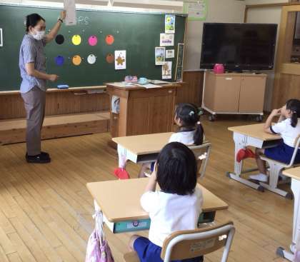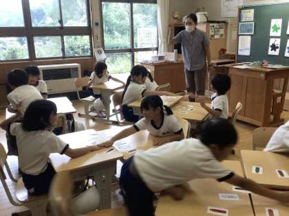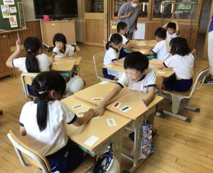 1・2年生の英語の学習です。今日は、ALTの先生に「色」の言い方を教えてもらいました。はじめに、10種類の色の英語での言い方を練習しました。何度も繰り返し練習して、自信をもって言えるようになりました。次に、教室の中で色探しをしました。最後に、色カルタです。先生が伝えた色カードをペアで取り合いました。英語での色の言い方を覚えて、さっとカードを取っていました。