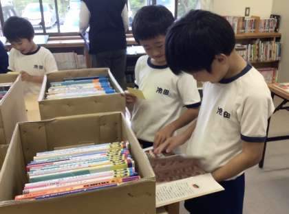 校内ブックフェアを開きました。新刊を含む多くの本を持ってきていただき、そこから図書室に配架してほしい本を子どもたちが選びました。本屋さんのようなたくさんの新しい本に子どもたちは大喜び。どの本がよいか、友達と相談しながら選んでいました。
