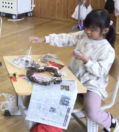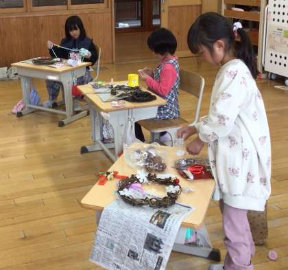 1年生が図画工作科でリースづくりを行いました。土台はサツマイモのツル、飾りは近くの神社で拾ってきた木の実や葉、家から持ってきたリボンなどです。かわいいリースやクリスマスみたいにしたいなど、自分のイメージをもとに思い思いに飾りつけました。来週の完成が楽しみです。