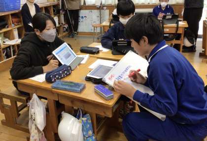 今日は、様々な投稿を読み比べて、読み手の賛同や共感を得られる説得の工夫を考えました。ペアやグループで話し合い、「実体験を入れるとわかりやすい」「データの数値を書くと納得してもらえそう」などの意見が出されました。次回からは、説得の工夫に気をつけながら、自分の意見を文章にまとめます。たくさん「いいね」がもらえる文にしようと張り切っています。