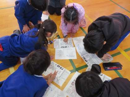 月曜日の朝活動では、縦割りで構成された「ファミリー班」で目標や行動計画を話し合いました。班長である6年生が科学館の全体地図を示しながら、みんなで回りたい場所を相談して決めています。