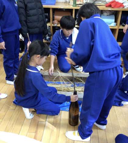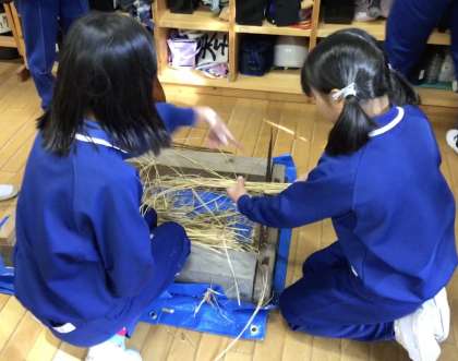 バケツで育てた稲を昔ながらの方法で5年生が脱穀・もみすりをしています。使う道具は、米作りの地域講師のお宅から借りた千歯扱きと一升瓶です。今日は、3年生に体験会を開きました。初めて見る道具に戸惑いながらも5年生の優しいアドバイスを受け、少しずつ玄米にしていきました。白米になる過程を見る貴重な体験となりました。