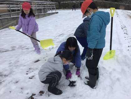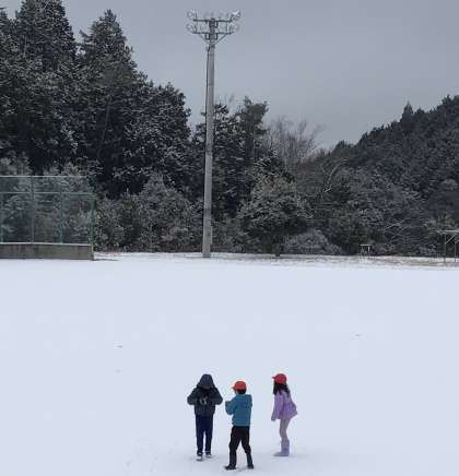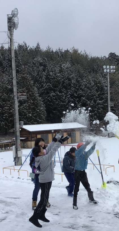 子どもたちは、大喜びで雪だるまを作ったり投げ合ったりしていました。寒い中、ほおを赤くしながらも,楽しそうに走り回っていました。