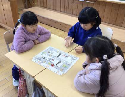 1・2年生が英語で身体の部分の言い方に親しみました。まず、頭や手、目、耳などの言い方を繰り返して練習しました。次に、ミッシングゲームをしました。隠れたカードを当てるゲームです。最後は、すごろくです。身体の部分の名前を言いながらゴールを目指しました。友達とゲームをしながら、楽しく英語に親しんでいました。