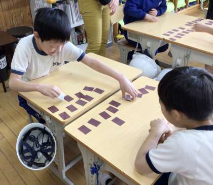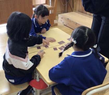 まず、車や飛行機、船、電車など乗り物の言い方を繰り返し練習しました。その後、ミッシングゲームや神経衰弱、すごろくなどゲームを通して、楽しく英語に親しみました。