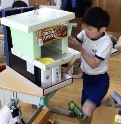 空き箱などの材料を生かして「小さな友だち」が喜ぶ家を考えながら作る学習です。箱を切ったり組み合わせたりして、立体的な家が少しずつできてきました。「ここはテレビを見る部屋」「エレベーターも作ろう」など想像を膨らませ、楽しんで作っていました。