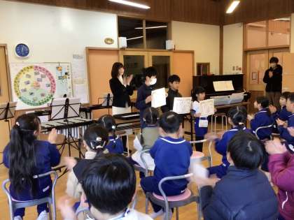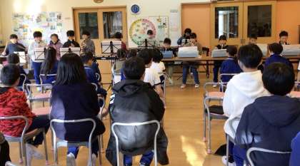 まず、読書感想文画と書き初め大会の表彰をしました。次に,校歌を歌いました。最後は、3・4年生によるミニコンサートです。いろいろな音の響きを楽しめる合奏を披露し、たくさんの拍手をもらいました。