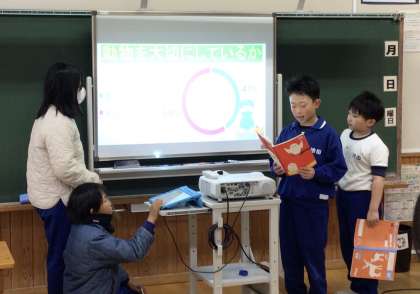 これまで、グループで調べたいことを決め、全校の子にアンケートをとり、結果をまとめてきました。今日は、調べたことを報告しました。グラフや図を使った資料をもとに、自信をもって発表できました。