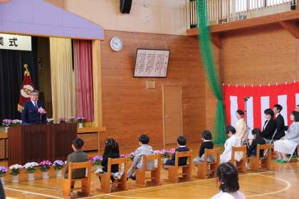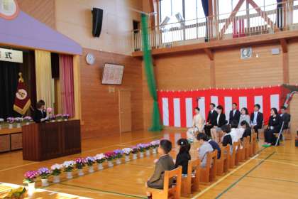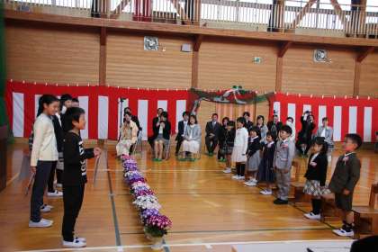 ピカピカのランドセルを背負って登校して来た1年生。大きな声で返事をする姿が素晴らしかったです。その姿を見守る2年生から6年生にはお兄さん,お姉さんとしての優しさを感じました。とても温かい式になりました。