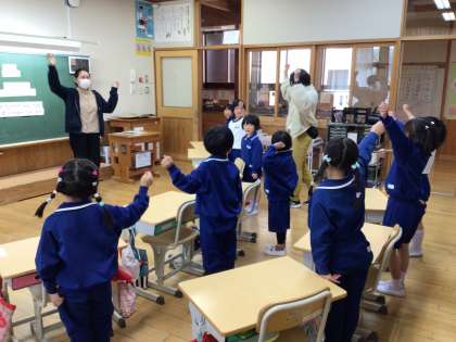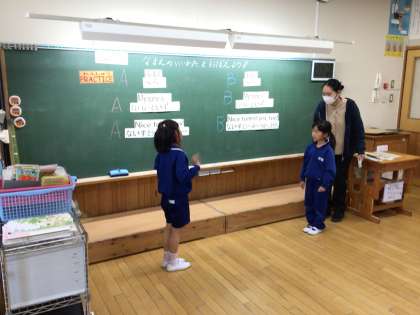 1・2年生では、英語での挨拶の仕方や名前の言い方を学びました。3人の2年生がお姉さんとして1年生に優しく教えている姿が印象的でした。今後もネイティブの先生とも親しみながら楽しく学び、英語のコミュニケーション能力の基礎となる力を養っていきます。
