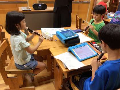 5時間目は3・4年生の音楽で研究授業を行い、他校の先生にも授業を見ていただきました。その後、音楽の授業においての学習用タブレットの効果的な活用の仕方、拍子やリズムに興味をもってグループで音楽活動に取り組む児童への支援の仕方等について教員で話し合いを行い、学びを進めました。