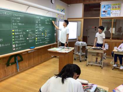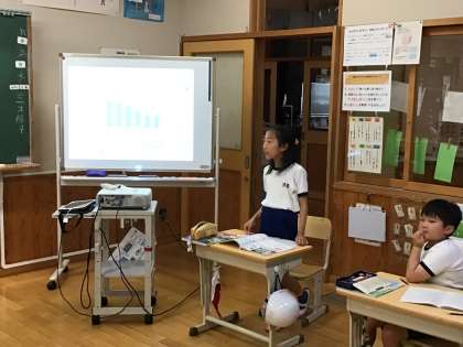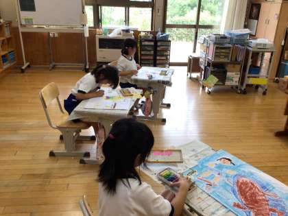 少しずつ学校生活のリズムが戻ってきています。2年生は図工で夏休みの思い出についての絵を描いていました。5年生、6年生は社会科でそれぞれ水産業、武士の登場について学んでいました。