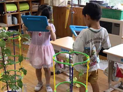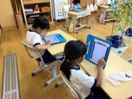 1年生の生活科の様子です。アサガオが夏休みの間にどのくらい成長したか観察し、学習用タブレットで写真を撮ってタブレットの中の提出箱にそれぞれが送信して情報を共有していました。