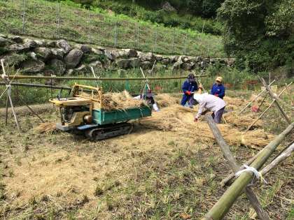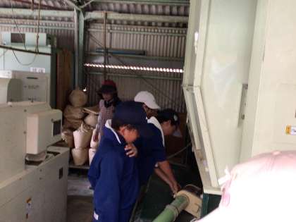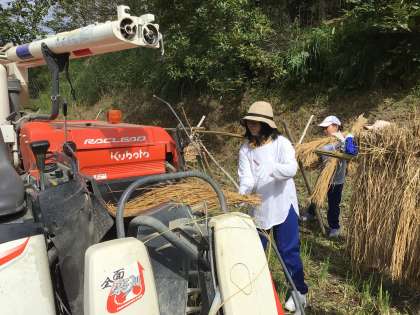 先日、稲刈りをした稲の脱穀(稲こき)を5年生が行いました。コンバインや大型の乾燥機などの機械を初めて目にする子もおり、興味深く観察していました。また、作業も地域講師の方の指導のもと、汗をかきながら一生懸命取り組んでいました。