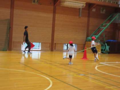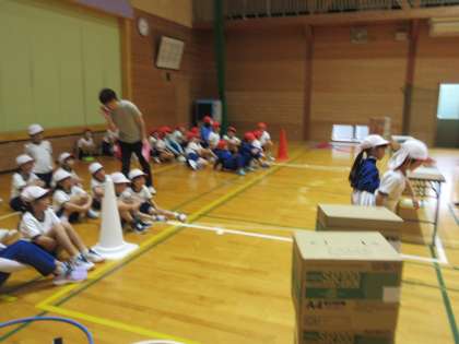 1時間目に運動会の競遊の練習を行いました。運動場で行う予定でしたが、あいにくのお天気のため体育館で行いました。競技の内容はペアでカードを引き、そのカードに書いてある指令に従ってコーンを回って帰ってくる競走でした。長い竹の棒を持って走る、二人三脚で進むなど様々な指令に苦戦しながらもペアで協力してがんばっていました。
