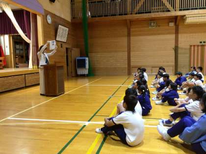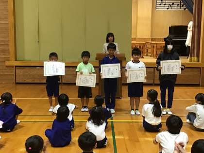本日で前期が終了し、終業式が行われました。式の前に夏休み中に書いた読書感想文や生活作文、詩の表彰が行われました。式では、校長先生からあゆみ(通知表)の見方とノーベル賞についてのお話がありました。あゆみについては、書かれている内容をよく見て、前期がんばったことに自信をもったり、後期にがんばる目標を決めたりするとよいというお話でした。ノーベル賞については、受賞された方々が長年に渡って、自分の夢の実現を諦めずに粘り強く努力を続けたことを話されました。
