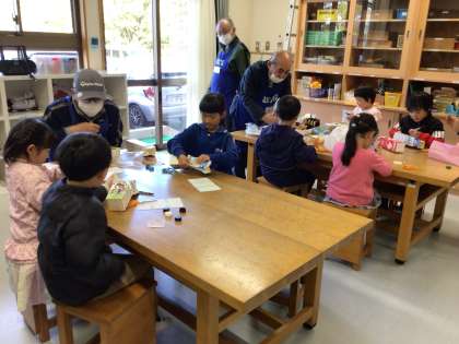 固い牛乳パックを切るのに苦戦している子もいましたが、講師の方々の助けも受けて楽しい作品を完成しました。材料の準備ありがとうございました。
