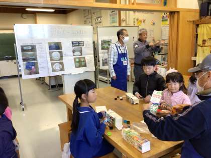 1・2年生が豊田市から講師の方々に来ていただいて「ものづくり教育プログラム」の授業を行いました。家庭から持参した牛乳パックを切ったり、ホッチキスで材料を留めたりして作品を作りました。