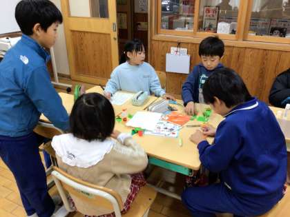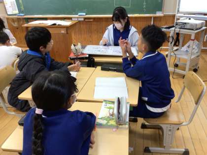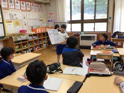3・4年生は冷田のまち探検の準備をしていました。5年生は、話し合いの技術を高めることを意図しながら、総合的な学習で、今後の冷田の米作りについて話し合いを行っていました。