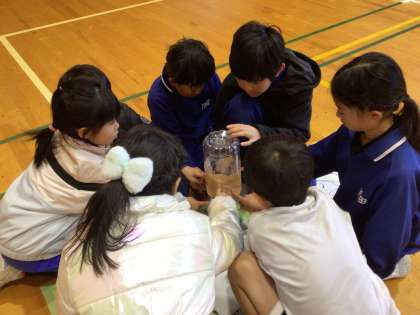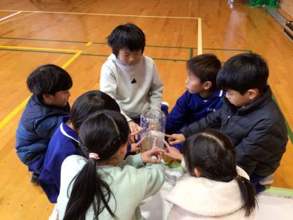 お昼の休み時間にファミリー班(縦割り班)の活動のファミリートークを行いました。この活動では、1つの活動を通して一緒に何かを作りあげたり、たくさん対話したりすることで全校児童の絆や仲間意識、思いやりの心を育てることを狙いとしています。本日の活動では大きなペットボトルにつけた水性ペンをみんなで一緒に持って指定された絵を描く活動を行いました。みんなで協力して絵を完成させ、多くの子がとても満足そうな顔をしていました。