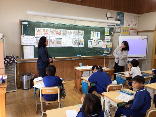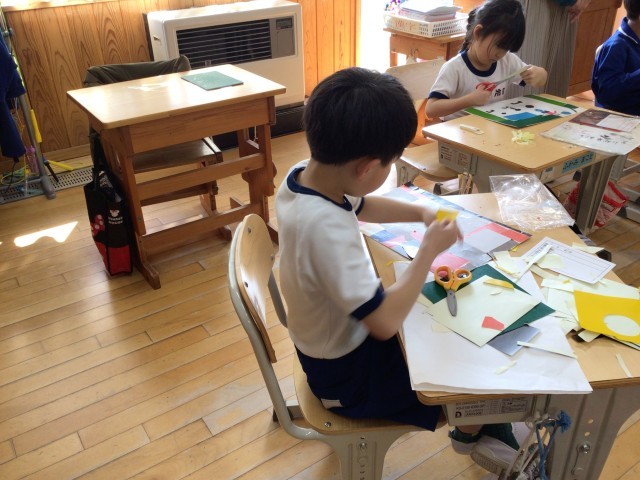1年生が図画工作科で制作していた紙版画が完成しつつあります。色とりどりな作品ができています。3・4年生の外国語活動では、体育館、図書室などの場所についての英語での言い方を学び、まっすぐ進む、右に曲がるなどの言い方を加えて、自分のお気に入りの場所を説明していました。