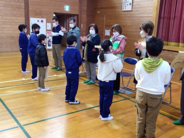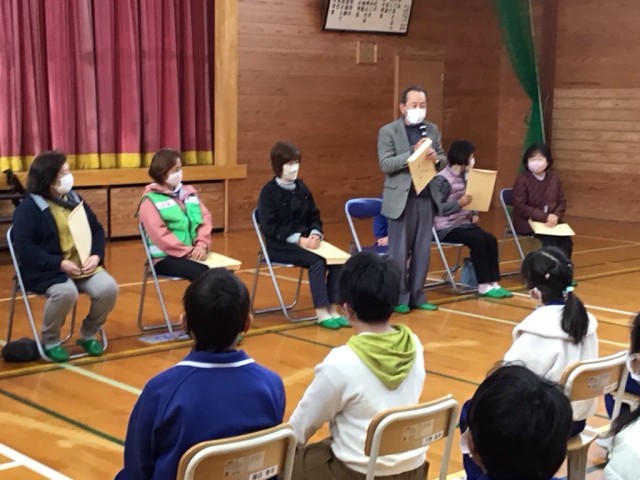 子どもたちの登下校のために見守りや野生動物への警戒、雪かきなどをしてくださった方々をお招きして感謝の会を行いました。子どもたちからは、感謝の言葉を伝えながらお手紙を渡しました。見守りをしてくださった方々からは、今後もみんな仲良く元気に登校してほしい、挨拶をしっかりしてほしいなどのお話をしていただきました。これからもみんな仲良く安全に気をつけて登下校しましょう。本日残念ながら所用等で参加できなった方々を含め、見守りをしていただいた皆様、ありがとうございました。