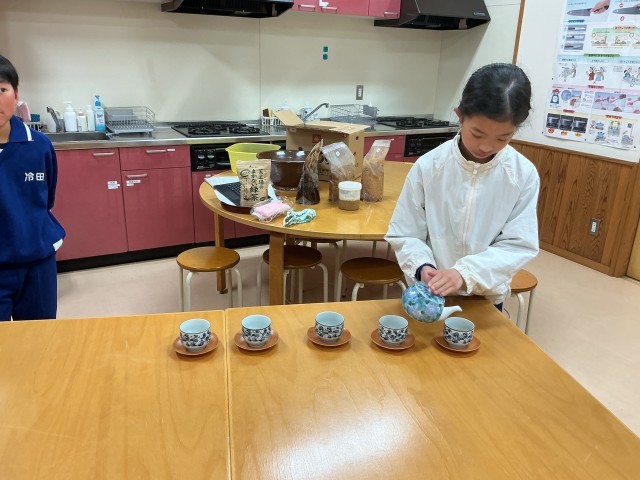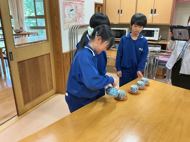 5年生は4年生まででは学習しなかった教科の家庭科に今年度から取り組んでいます。本日は、「お茶を入れよう」の学習で、お茶の入れ方を学びました。その後、一人一人が実際にお茶を入れ、茶托に乗せてふるまうところまで体験しました。まさに日常生活に生きる学習になったと思います。ぜひ、これから家庭でも家族などに実践してみるといいですね。