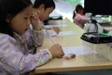 小筆を使って名前を書いています。ちょうどよい太さの線になるように、力の加減が難し...