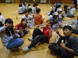 体育館で5年生がキャンプファイヤーのリハーサルをしていました。司会の言葉に合わせ...