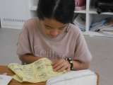 練習布を使って、「返し縫い」の練習をしていました。 「昔はこうやって手で縫って、...