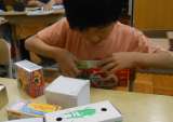 いろいろな箱を使って、形の学習をしました。 自分で箱を重ねたり、くっつけたりを繰...