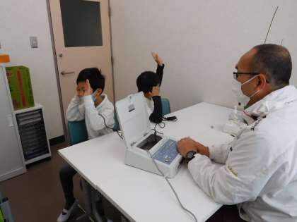 身体測定2 公開日 2021/04/14 更新日 2021/04/14 校長室から 学年ごとに並んで、検査の説明を聞いています。静かに指示を聞いて検査を受けることができたので、時間内に終わりました。 耳の検査は放送室で静かに行います。終わった後、「ああ、どきどきしたあ」と言って退室する子どもの姿が愛らしかったです。